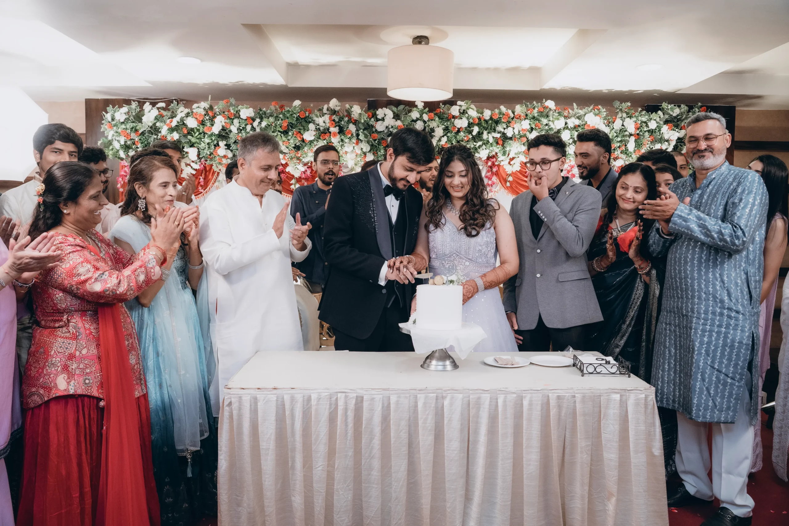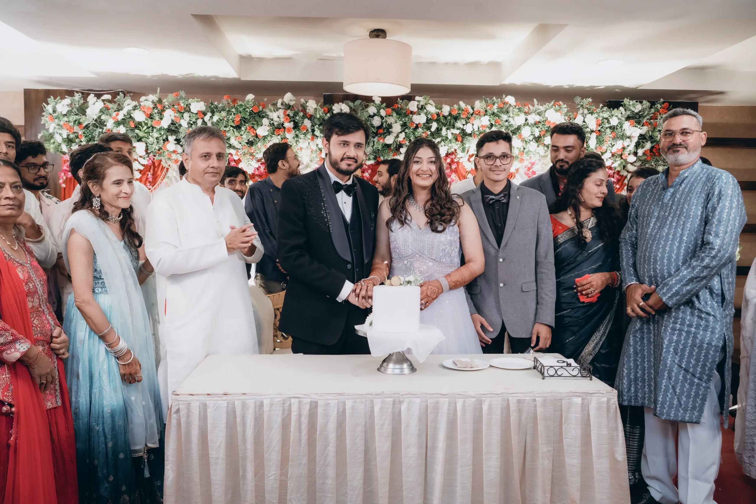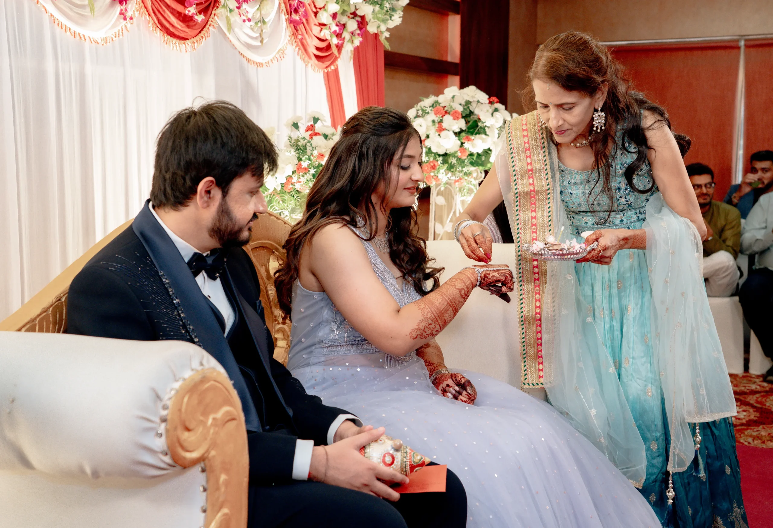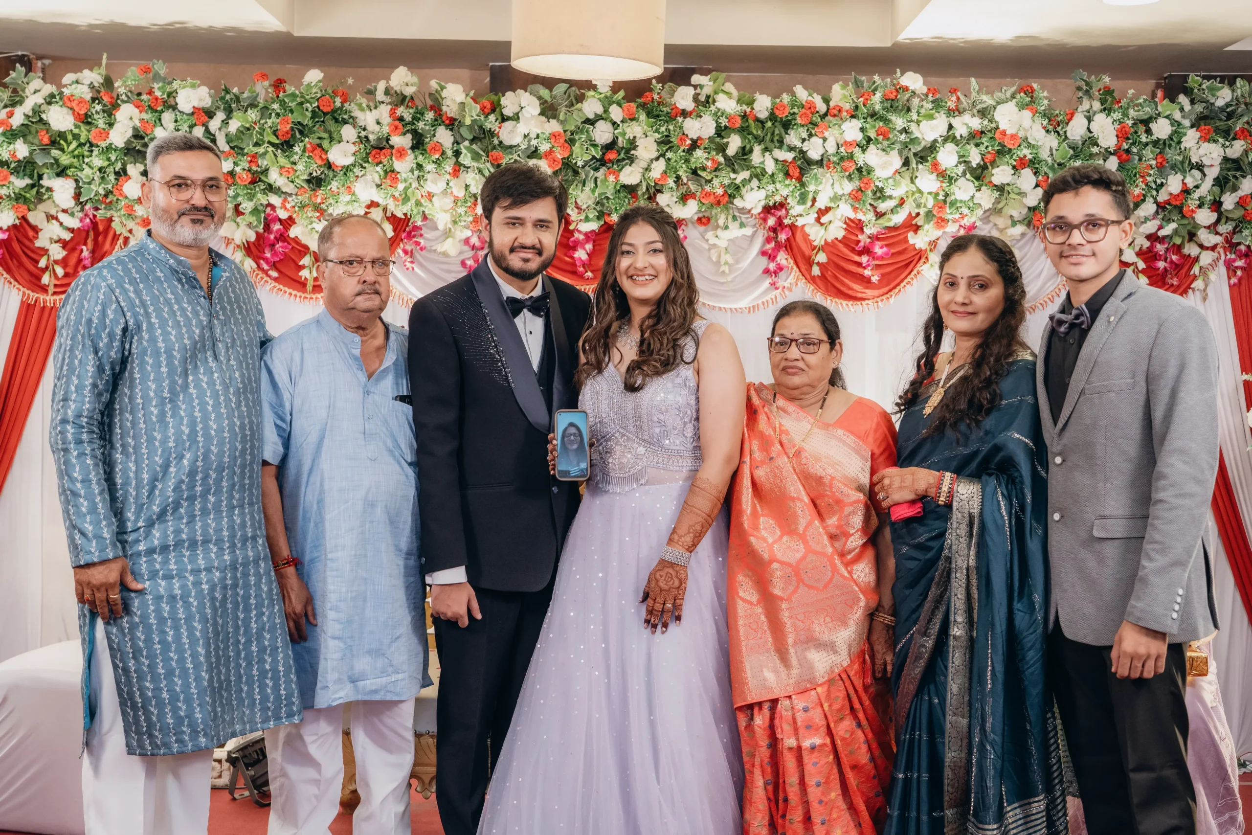 Surrounded by close family and cherished friends, the couple exchanged rings as the city hummed below them. Disha, radiant in blush and gold, and Deep, poised and smiling, shared a moment of quiet tenderness amid the celebration — a pause in the sparkle, just for them.